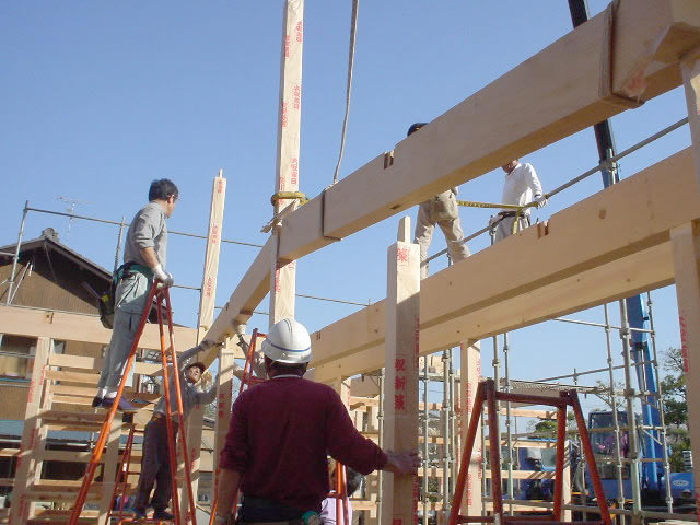 この仕事は米松材に墨付けするところから始まります。大工作業は軸組みがほとんど見える構造であるため、建て方まで日数を要します。金物を極力使わない伝統工法で上棟までの作業風景をご紹介します。なお、施工にあたって、どのような軸組とするかによって、採用する継手も仕口も変わってきます。ここでは参考例としてご紹介したいと思います。