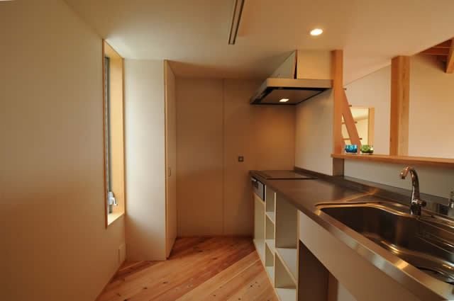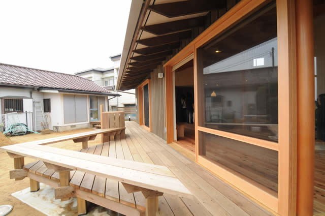 南面に向けて斜めに切り取り、家形や造作も三角形を多用し変化のある豊かな空間を創出。内外装ともに木材による温かみのある平屋の住まいが完成しました。建築施工写真