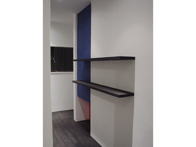 家具やコタツまでオリジナルデザイン、浮かび上がる赤と青、さらに朱や紺といった和風テイストが絶妙な色彩空間。漆喰と床の柿渋ペイントというモノトーンなコントラスト建築施工写真